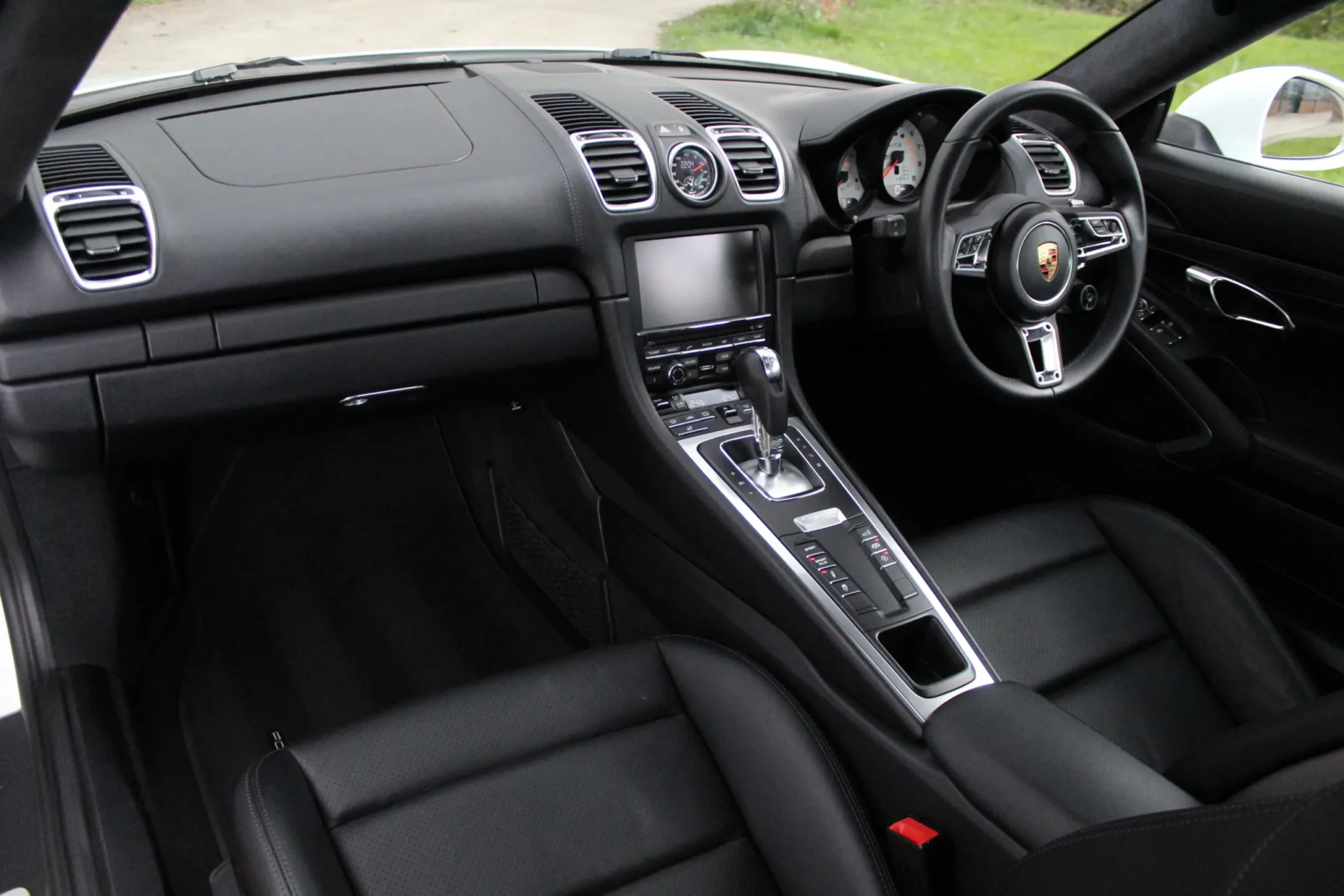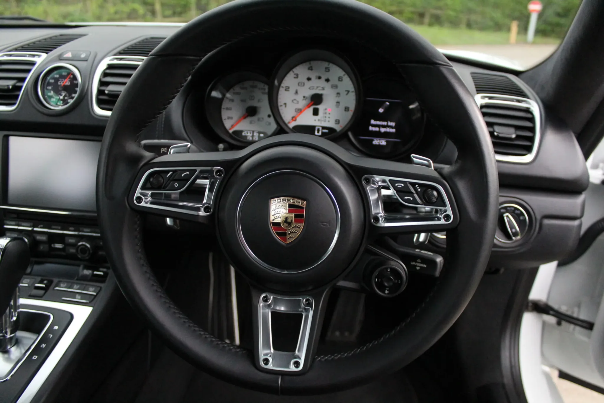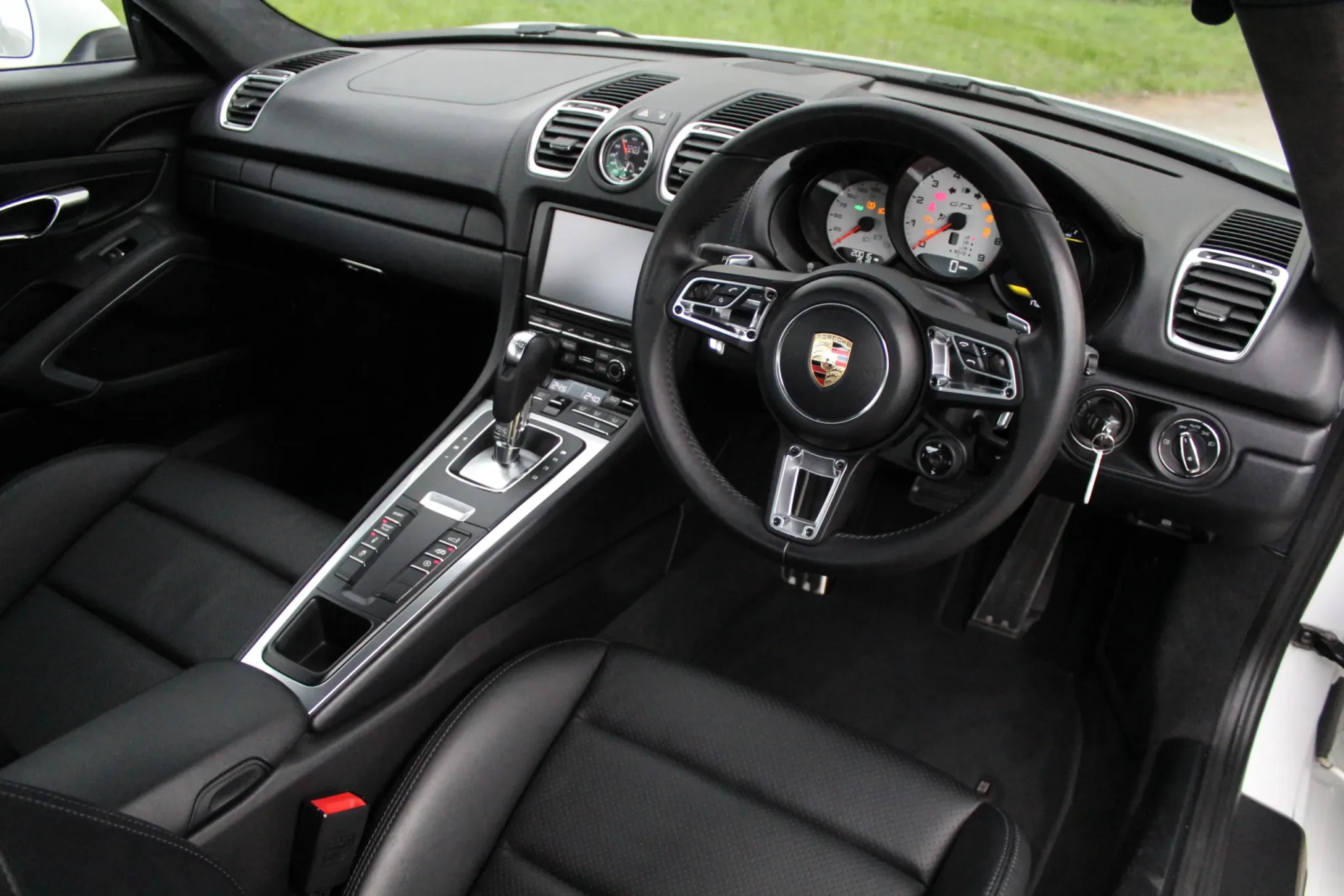 Contrasting black interior, representative of the ultra-low mileage completed, with no wear to note. High specification of optional equipment, including: Bi-xenon plus dynamic cornering light, black backed headlamps, Sports Design steering wheel with paddle shifters, 20″ Carrera S 3 wheels, TPM (tyre pressure monitoring), PADM (Porsche Active Drivetrain Mounts), rain sensor, sports hard back seats, Porsche crest embossed in headrests, seat heating, Sports Chrono Plus package, universal multimedia interface, instrument dials in Carrara White, Porsche Sports (switchable) Exhaust, trim strip including cup holder cover in leather, tail lights darkened. The usual GTS specification are also of course included, such as Power Kit +10hp, sound symposer, PASM (Porsche Active Suspension Management). At considerable expense, a genuine 718 GTS steering wheel has been fitted.