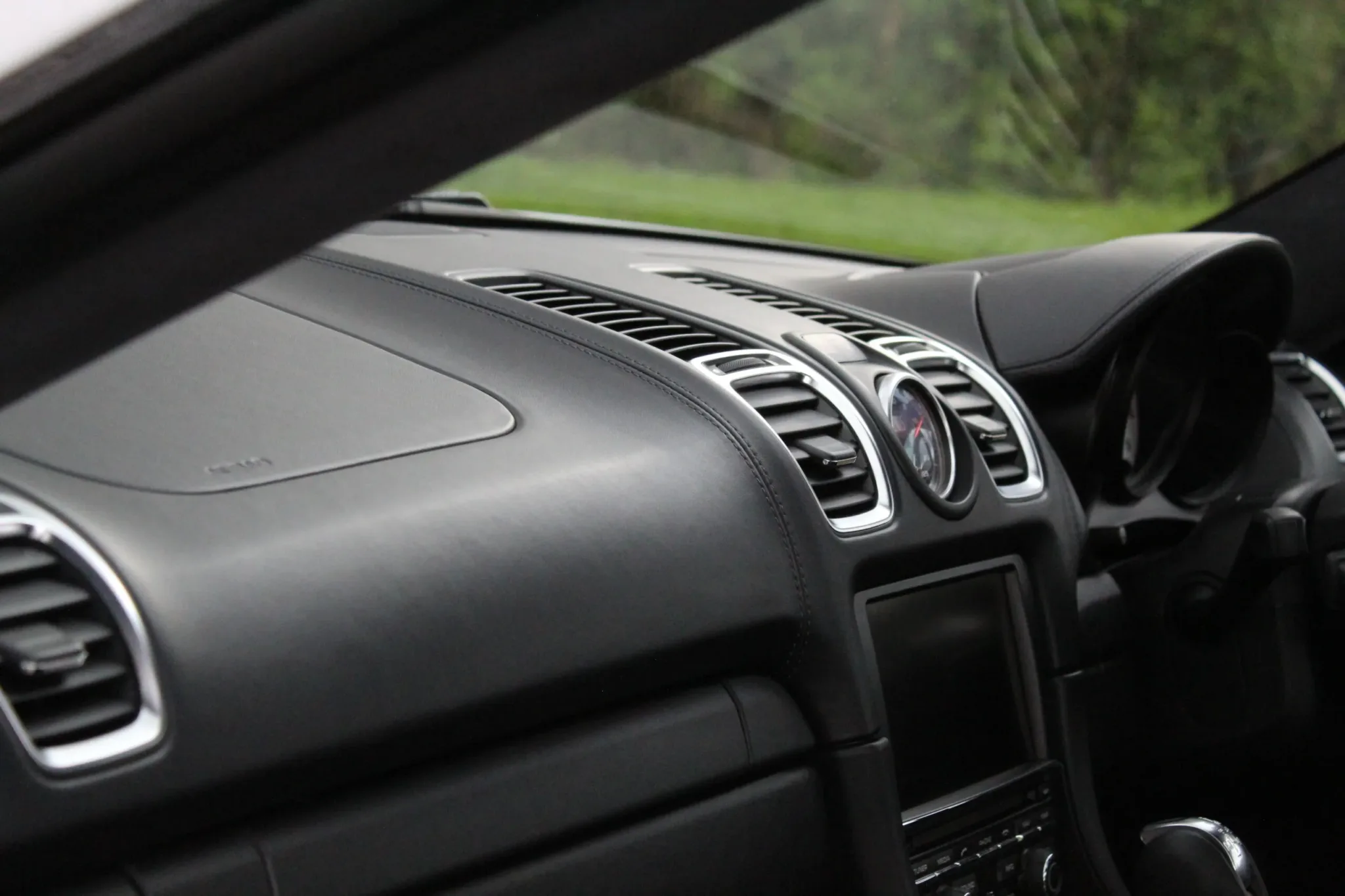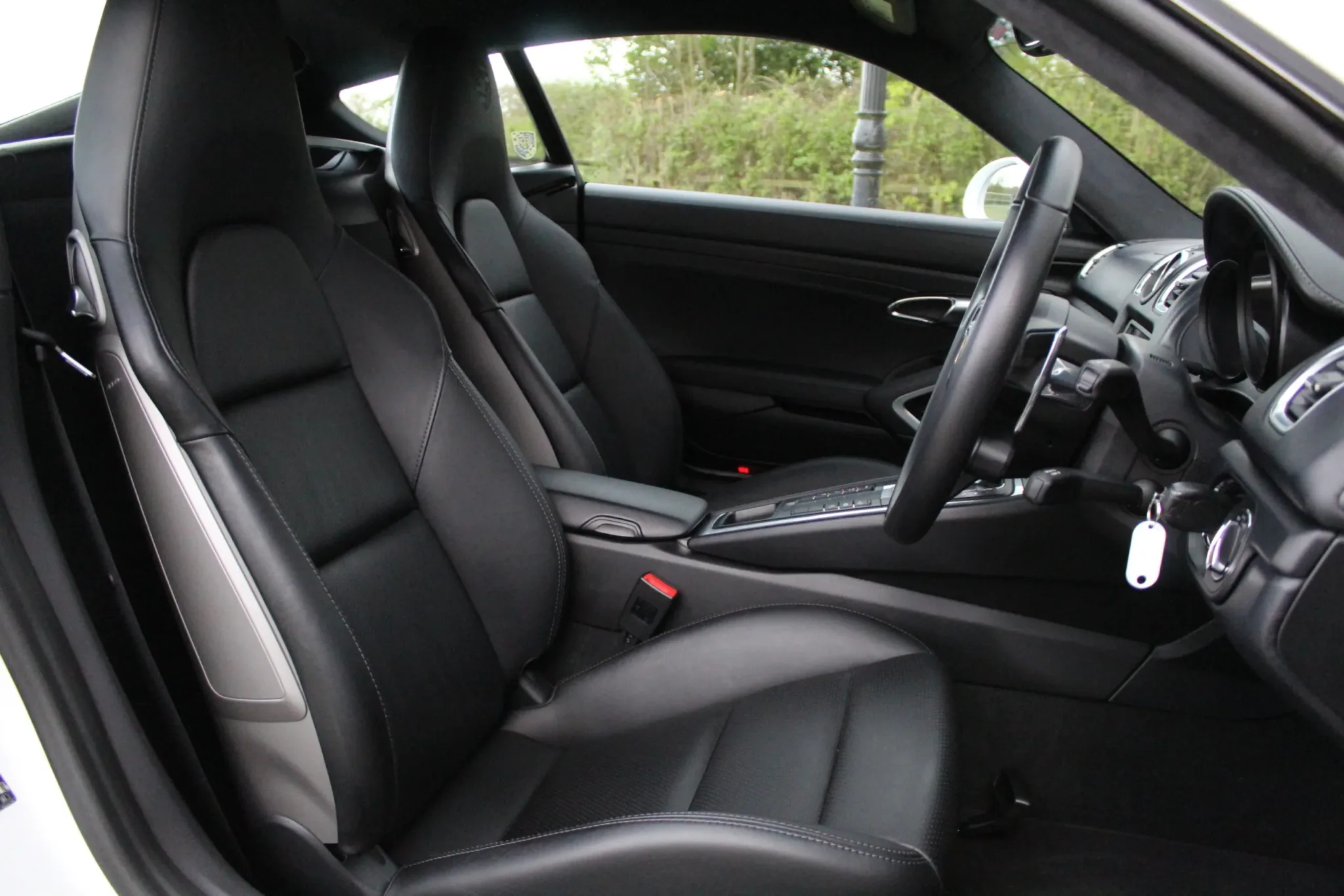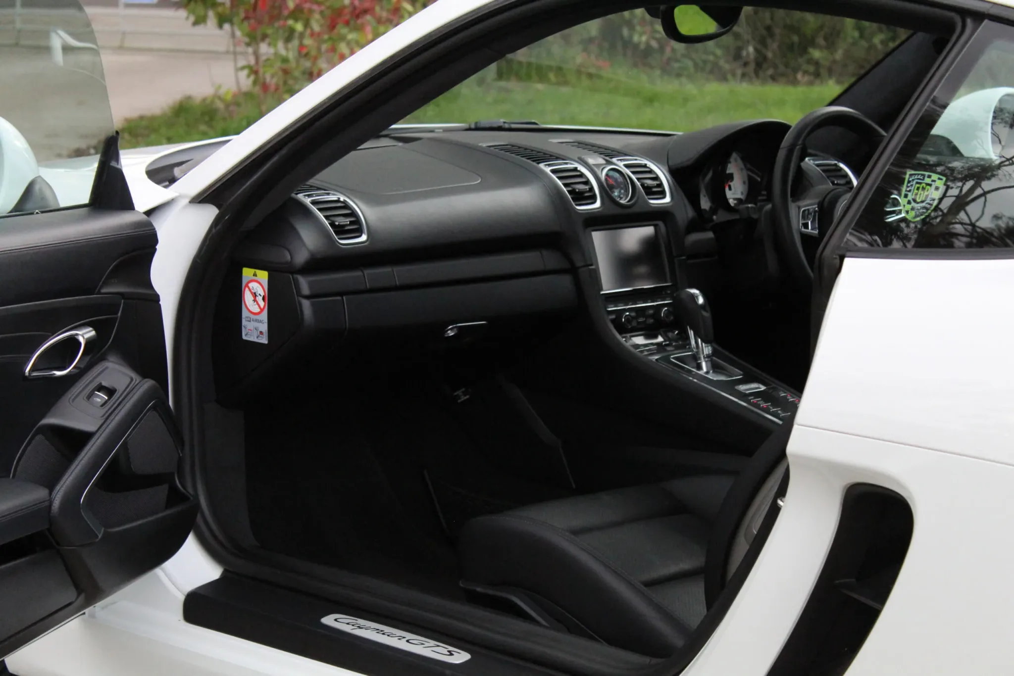 Contrasting black interior, representative of the ultra-low mileage completed, with no wear to note. High specification of optional equipment, including: Bi-xenon plus dynamic cornering light, black backed headlamps, Sports Design steering wheel with paddle shifters, 20″ Carrera S 3 wheels, TPM (tyre pressure monitoring), PADM (Porsche Active Drivetrain Mounts), rain sensor, sports hard back seats, Porsche crest embossed in headrests, seat heating, Sports Chrono Plus package, universal multimedia interface, instrument dials in Carrara White, Porsche Sports (switchable) Exhaust, trim strip including cup holder cover in leather, tail lights darkened. The usual GTS specification are also of course included, such as Power Kit +10hp, sound symposer, PASM (Porsche Active Suspension Management). At considerable expense, a genuine 718 GTS steering wheel has been fitted.